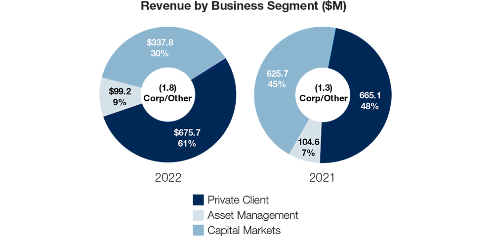 Our Capital Markets business was significantly and negatively impacted by the near shutdown in the issuance of public offerings, particularly those of high growth companies. These issuers raised record amounts of capital in 2021 and found little receptivity from investors in 2022 as the market adjusted to rapidly increasing interest rates and lower valuations on the prospects of future growth. We have seen these cycles before and we are confident that innovative companies in the technology and healthcare industries will continue to change the way we work and live, and will help to conquer the challenges faced by disease and other threats to our health. These enterprises may be forced to raise money at lower valuations, but many will reemerge in a more favorable environment to be the next market leaders.
