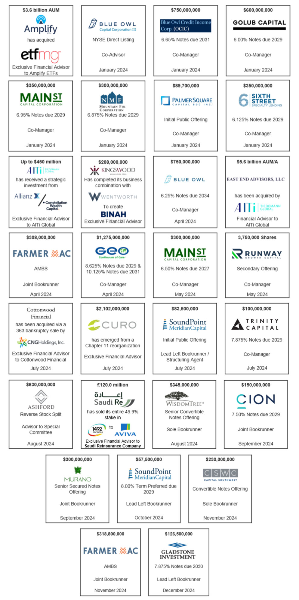 In 2024, GoldenBridge’s Financial Institutions Investment Banking team had a dynamic and successful year, executing a wide range of transactions and providing tailored solutions to meet the diverse needs of their clients. Through strategic capital markets activities and expert advisory services, the team demonstrated their commitment to delivering exceptional results and creating lasting value.